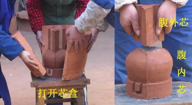 打開外范,去掉耳模,即得兩個(gè)完整的泥芯,將范面的泥片去除,這時(shí)范和芯之間就會(huì)形成型腔。